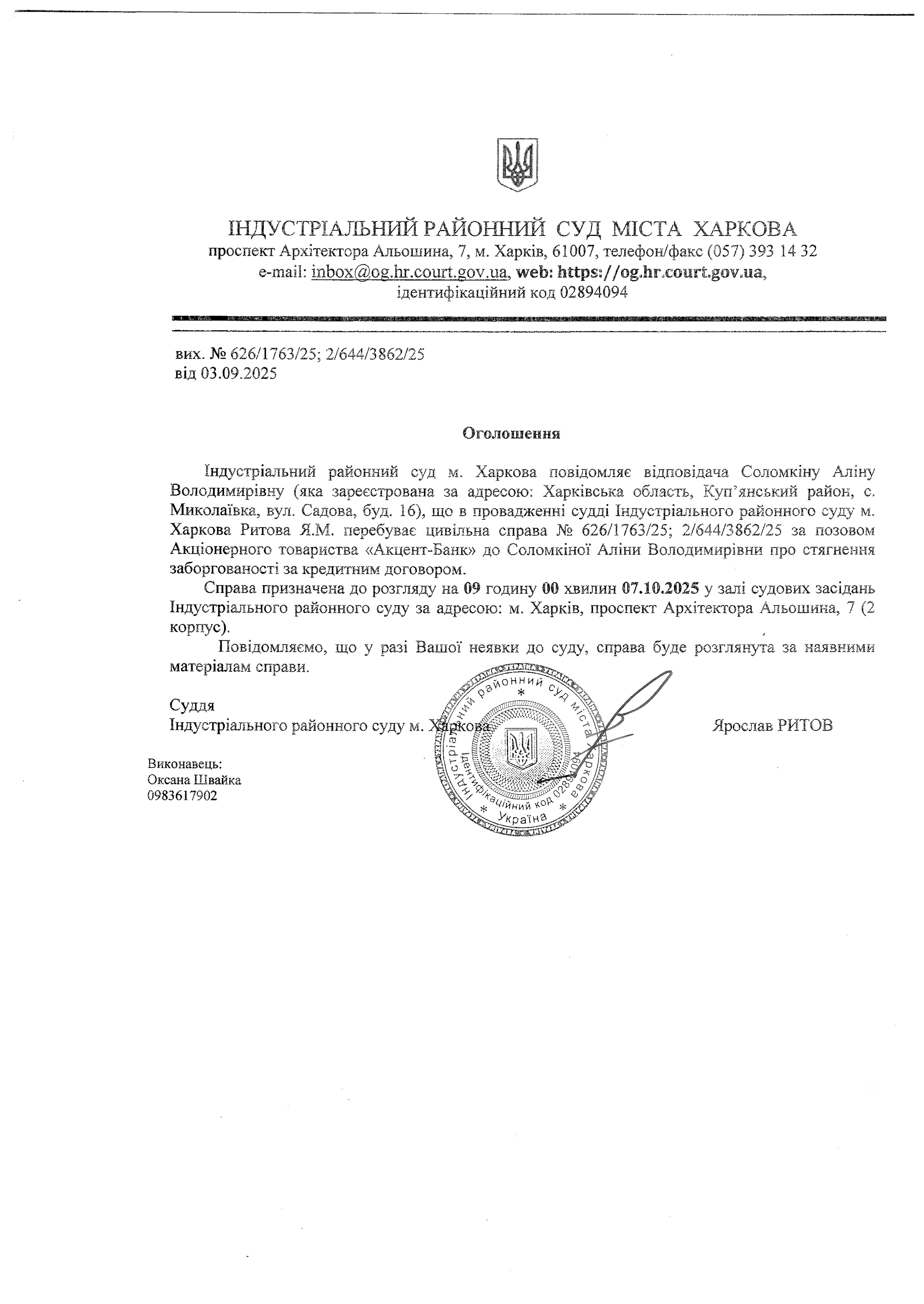 Оголошення про виклик особи в суд та повідомлення про судове рішення