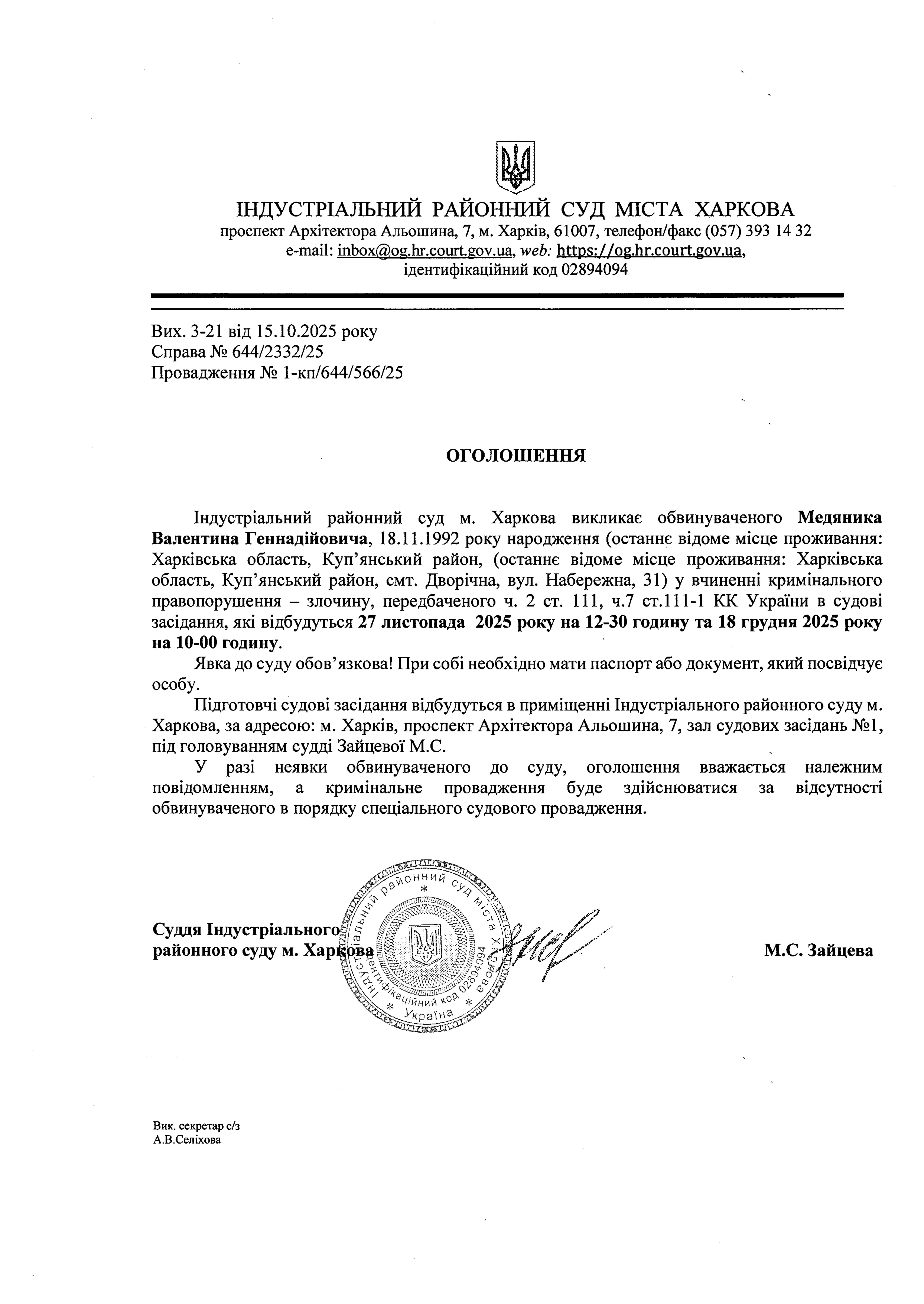 Оголошення про виклик особи в суд та повідомлення про судове рішення