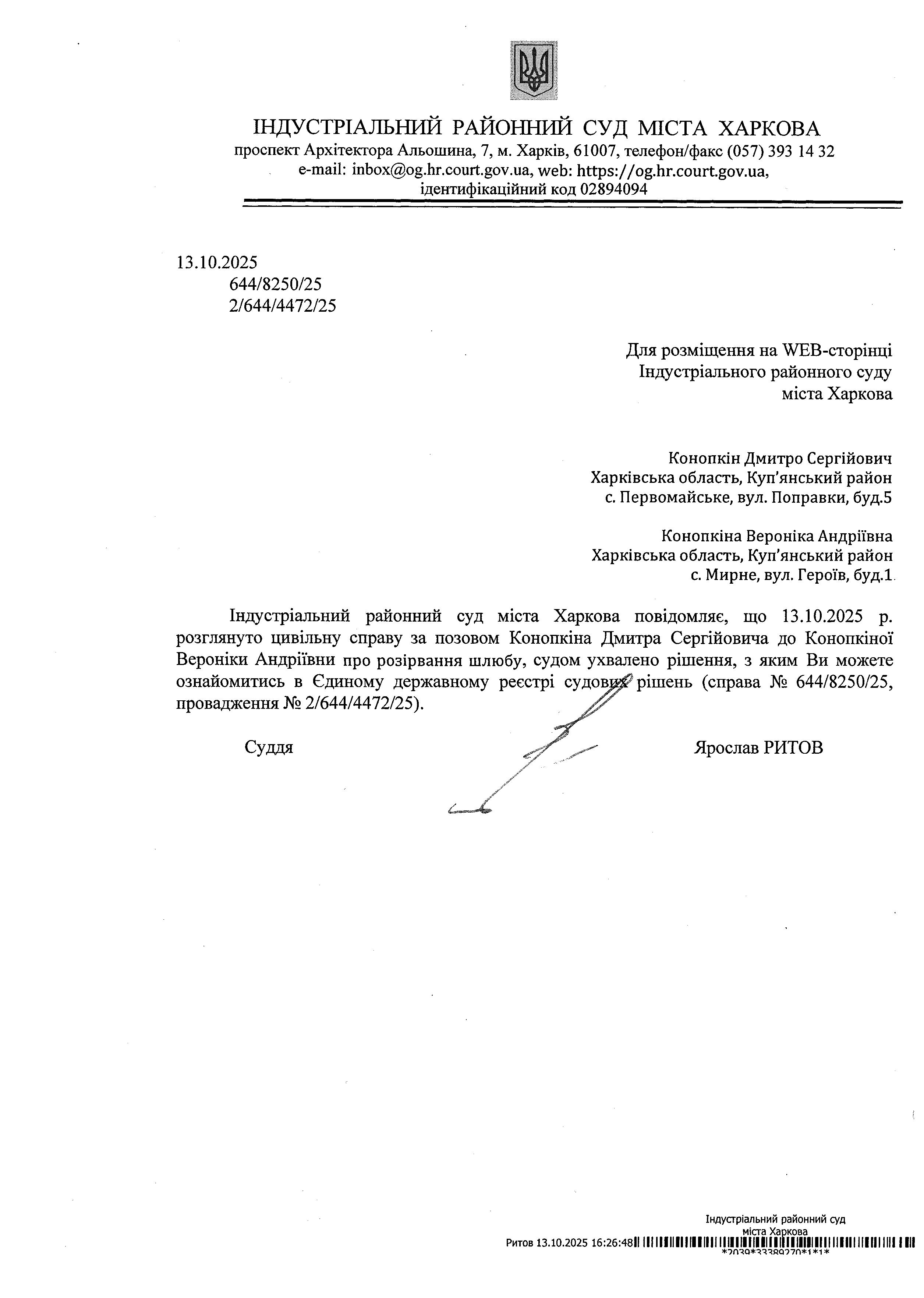 Оголошення про ухвалення рішення суду - розірвання шлюбу