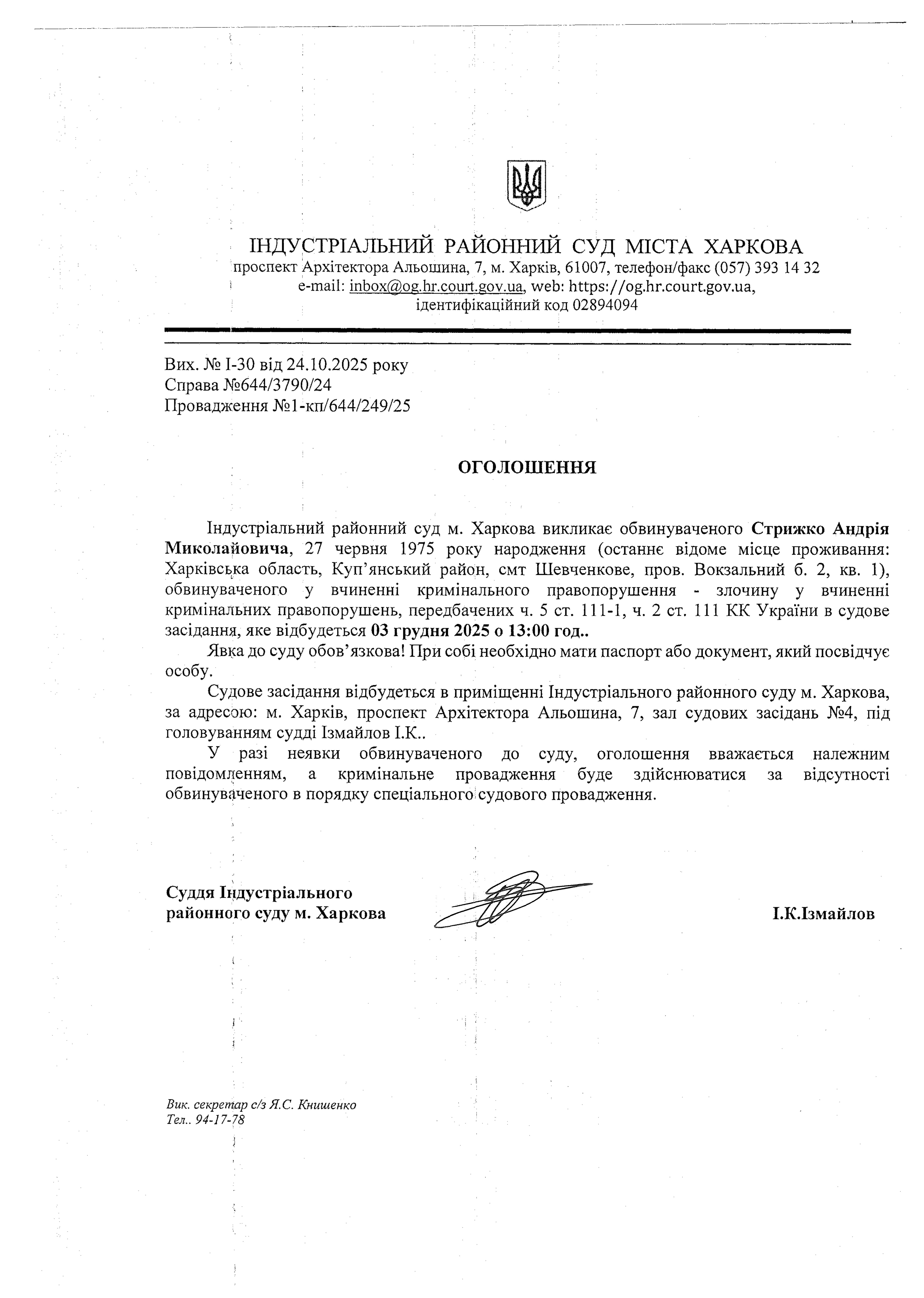 Увага, суд перейменовано з Орджонікідзевський районний суд м. Харкова