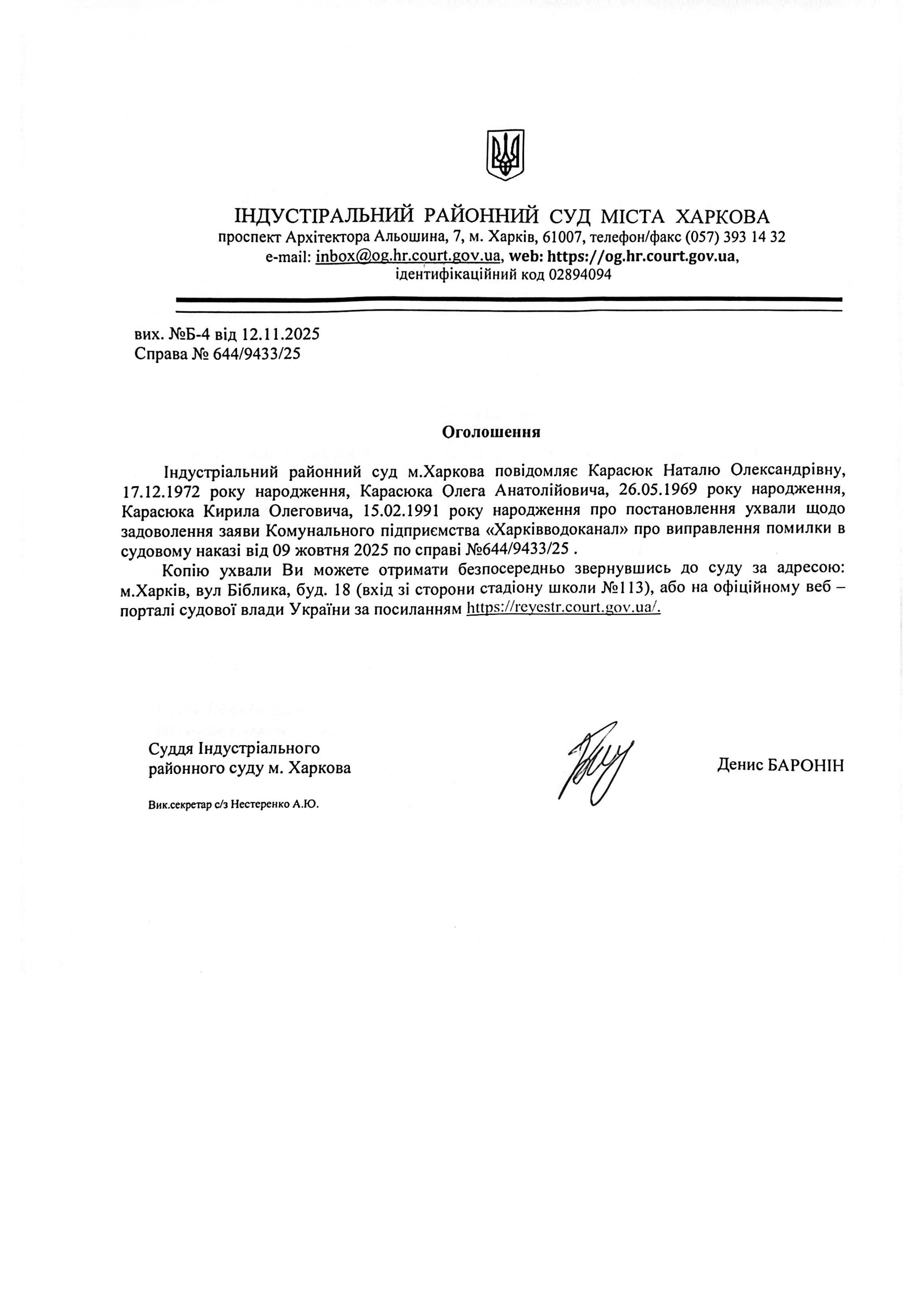 Оголошення про ухвалення рішення про виправлення помилки в судовому наказі