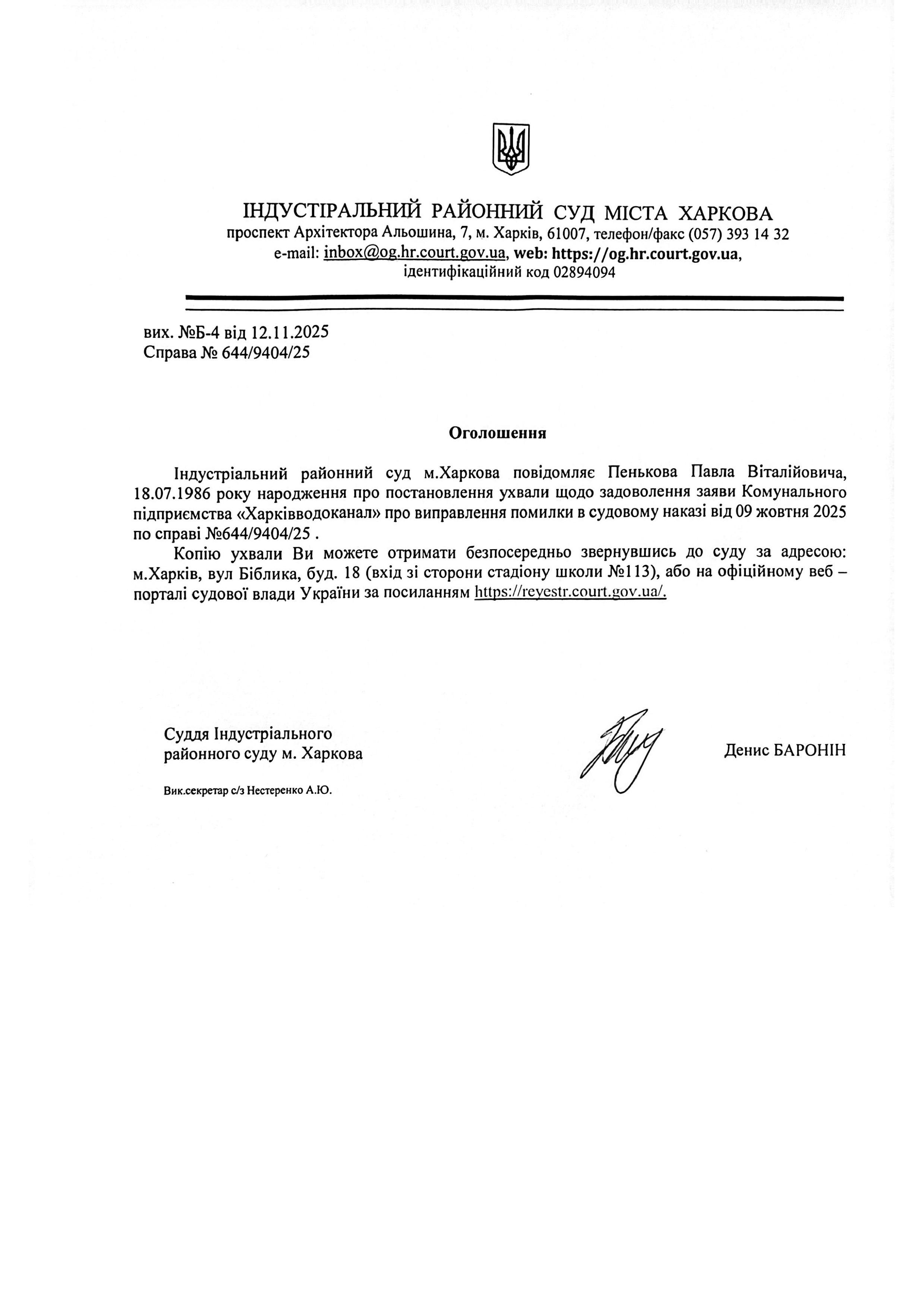 Оголошення про ухвалення рішення про виправлення помилки в судовому наказі