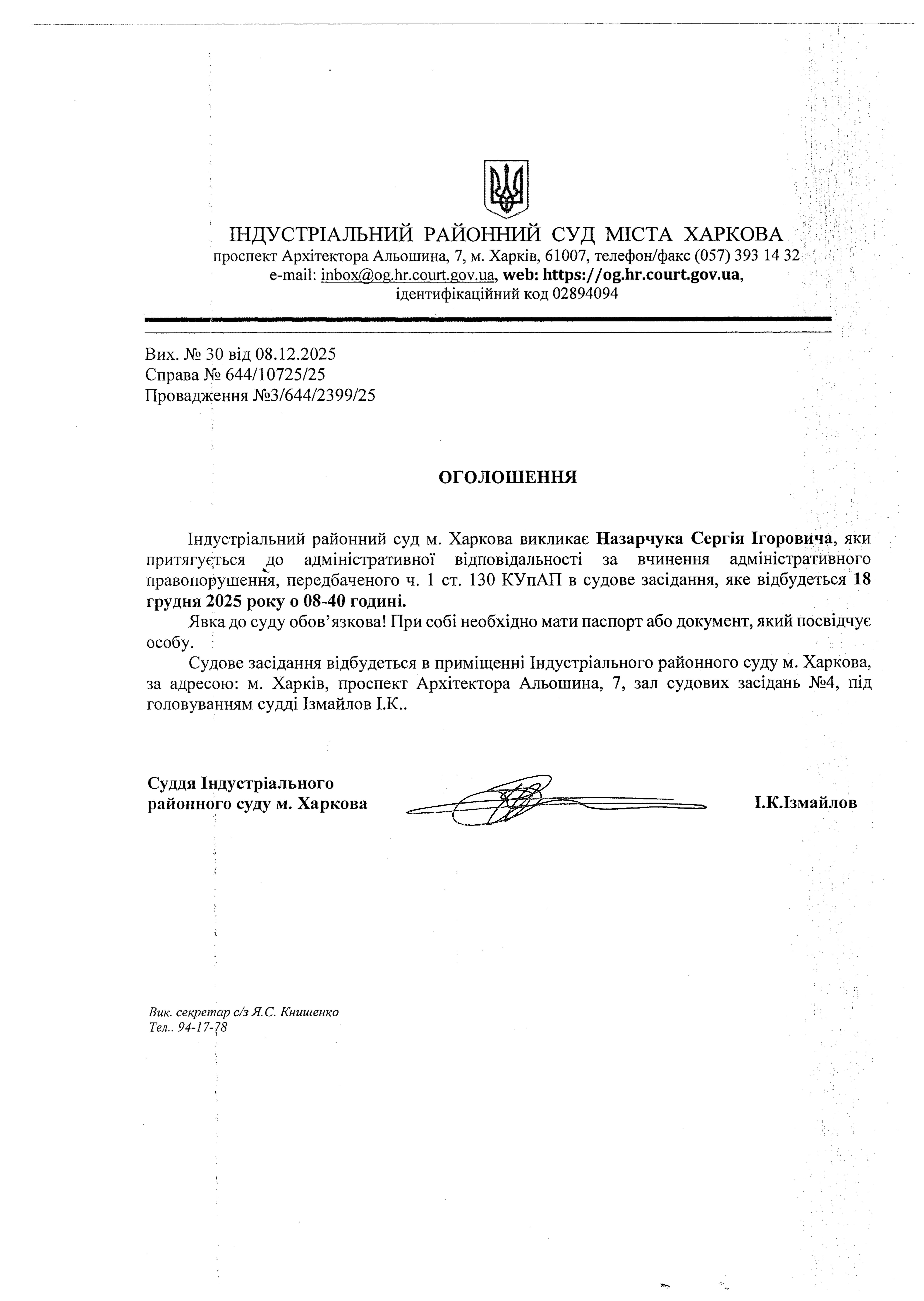 Оголошення про виклик особи в суд та повідомлення про судове рішення