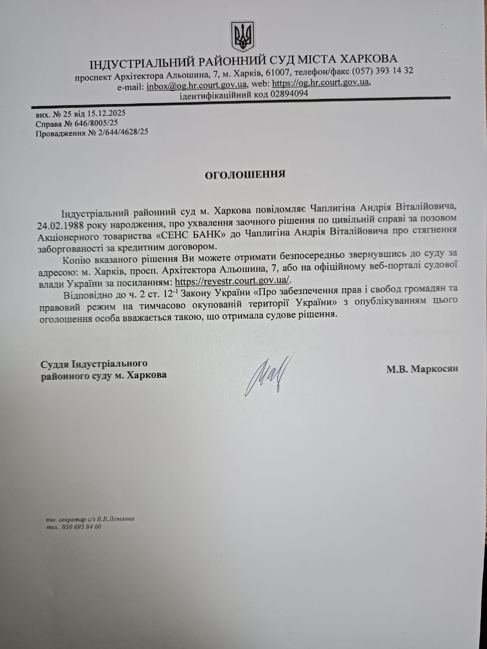Оголошення про виклик особи в суд та повідомлення про судове рішення