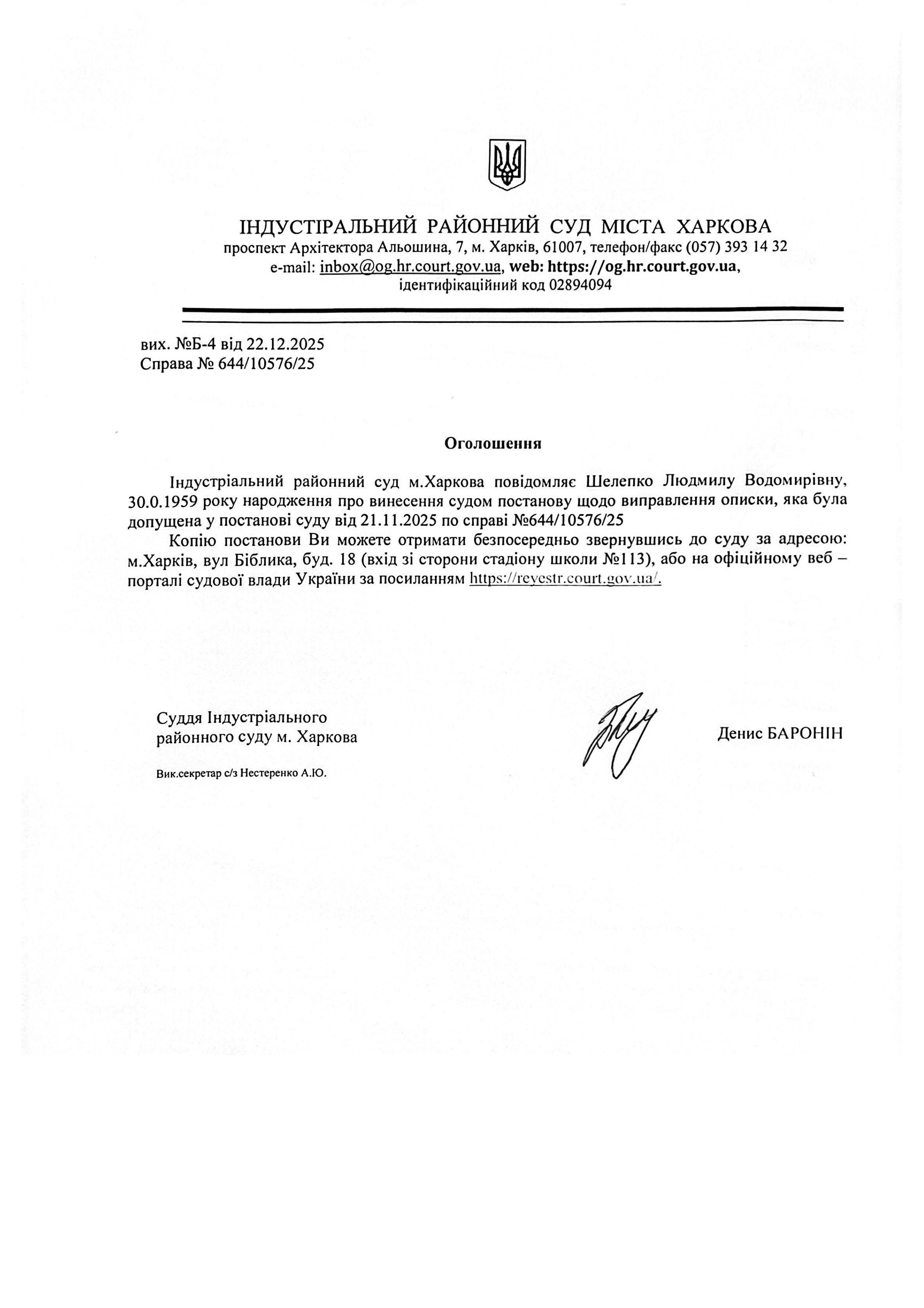 Оголошення про атправлення описки