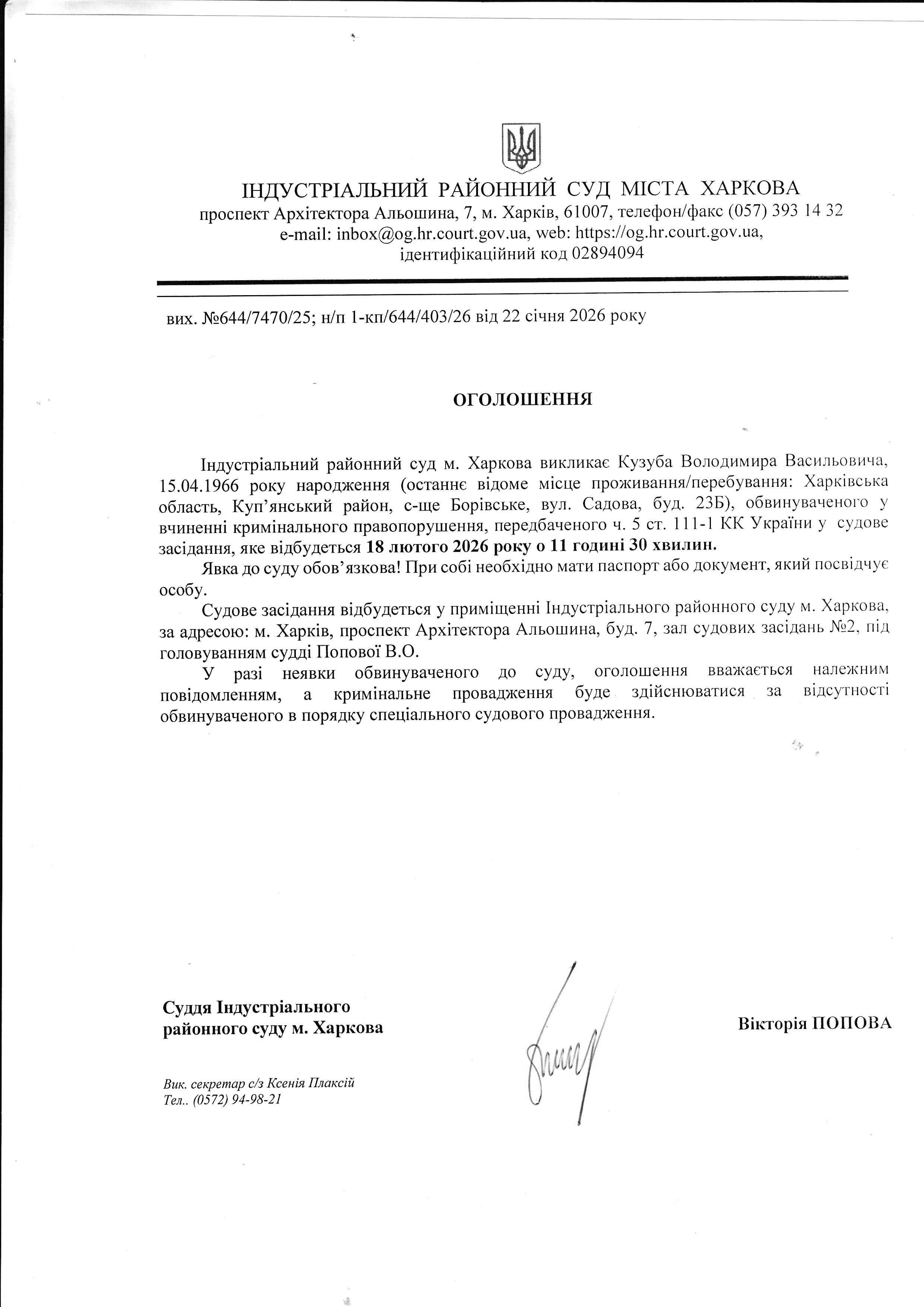 Оголошення про виклик особи в суд та повідомлення про судове рішення