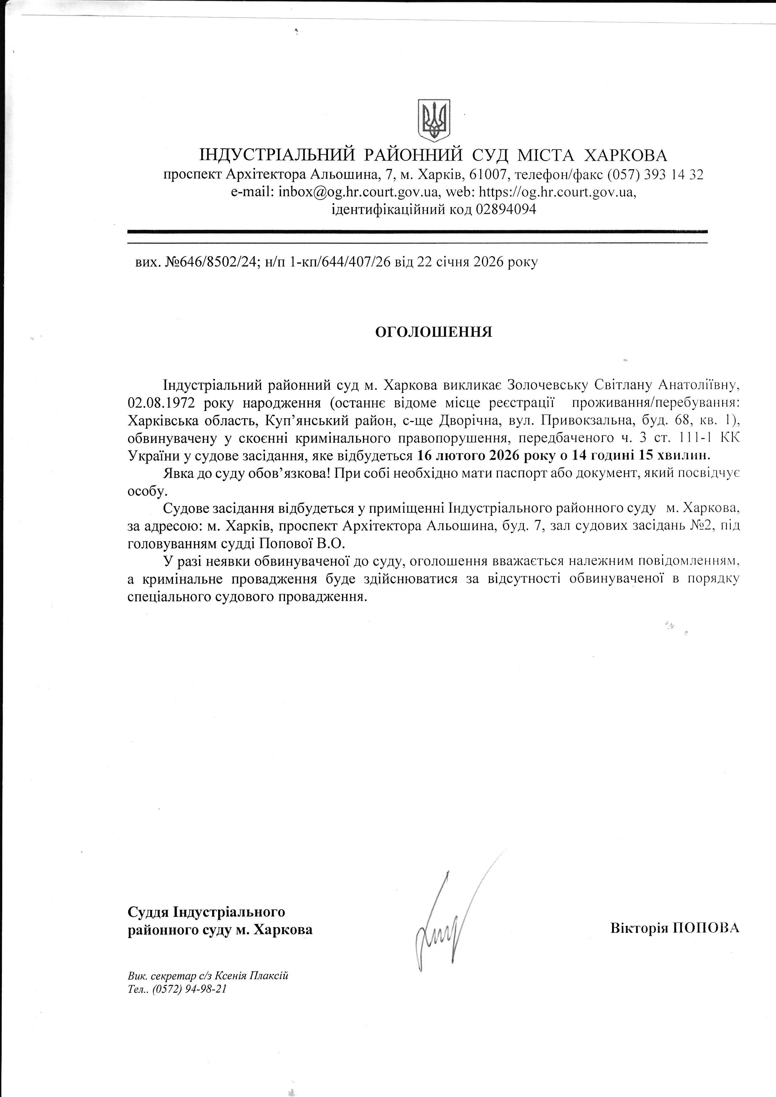 Оголошення про виклик особи в суд та повідомлення про судове рішення