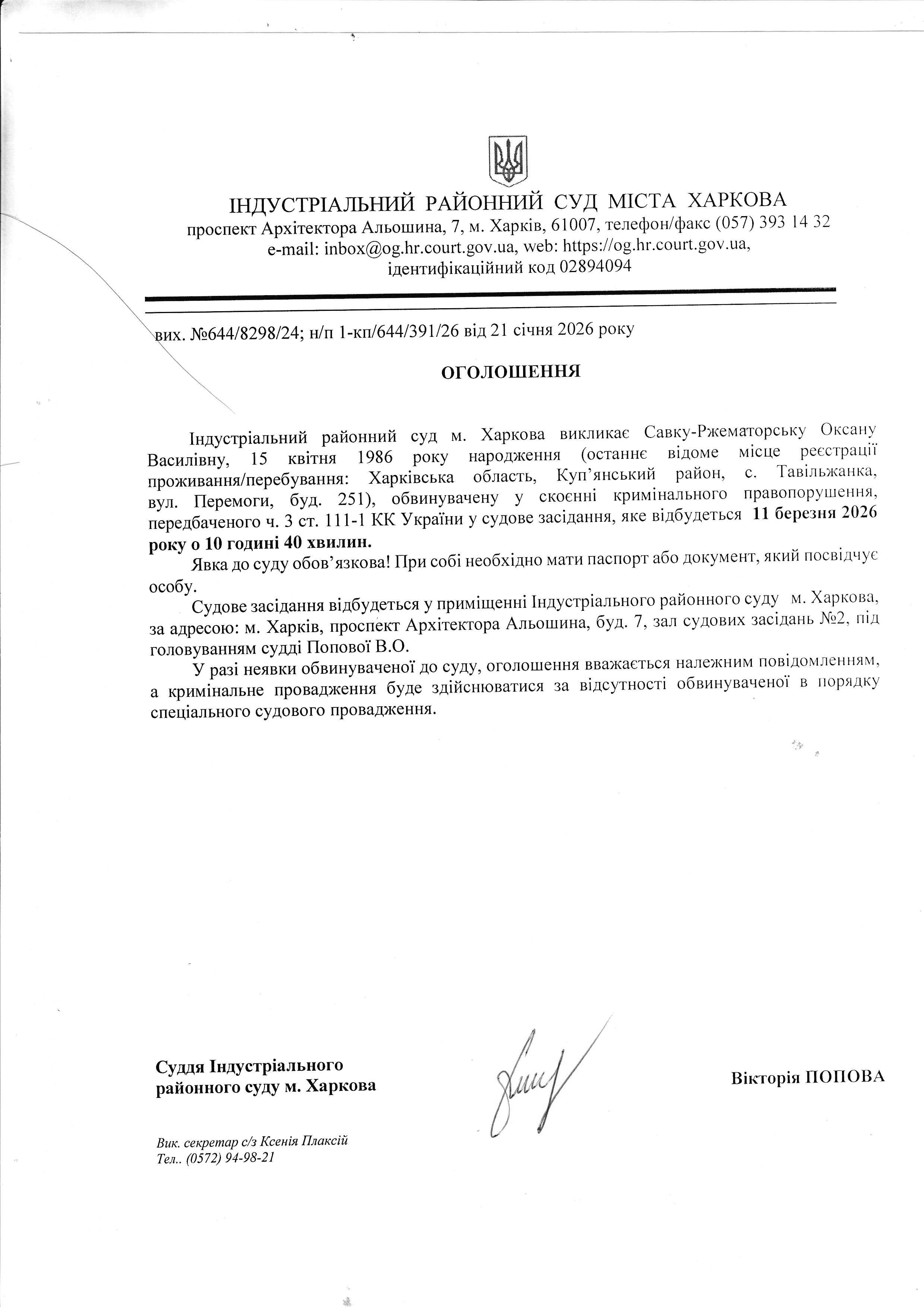 Оголошення про виклик особи в суд та повідомлення про судове рішення