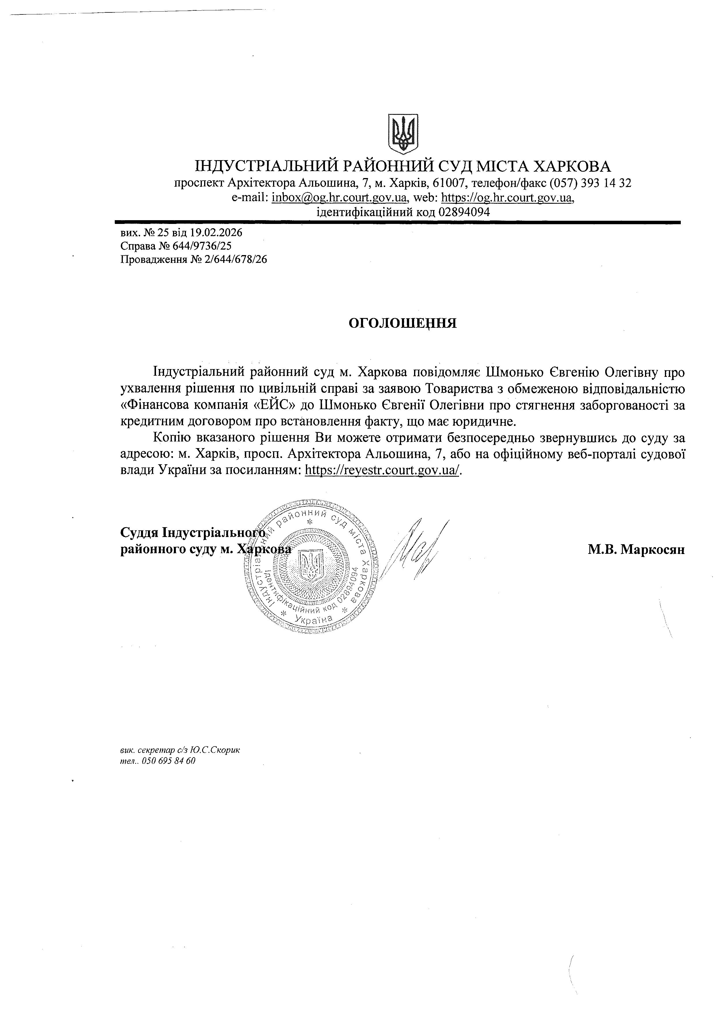 Оголошення про ухвалення рішення по цивільній справі