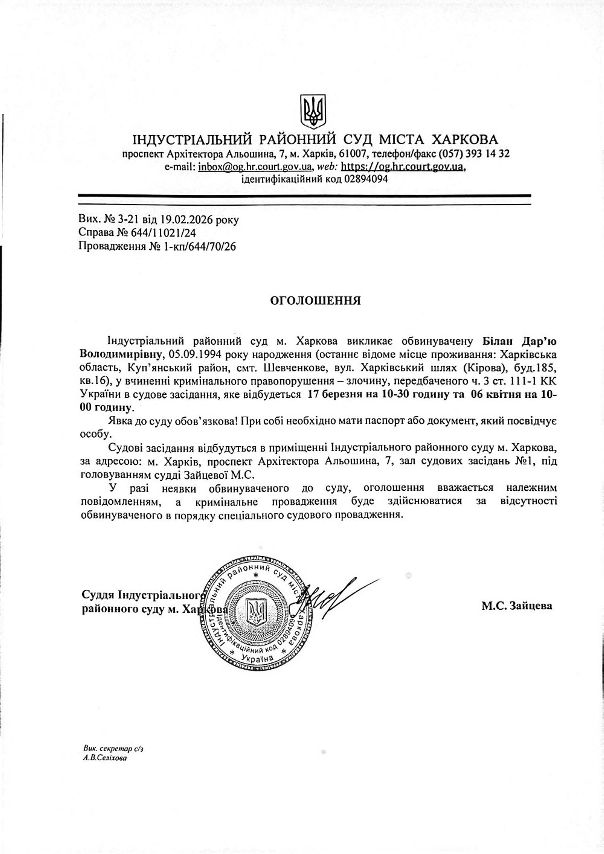 Оголошення про виклик особи в суд та повідомлення про судове рішення