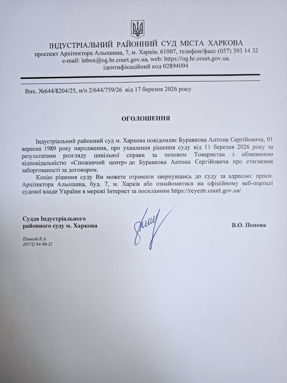 Оголошення про ухвалення рішення суду по справі за позовом ТОВ "Споживчий центр" до Буравкова А.С.