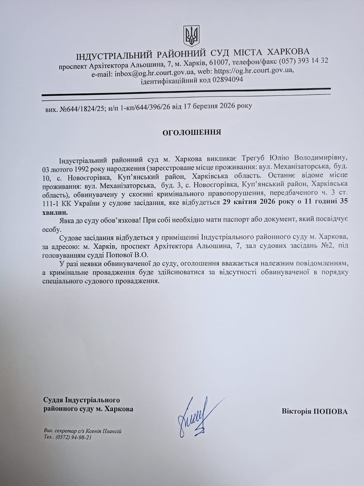 Оголошення про виклик до суду обвинуваченої Трегуб Ю.В.