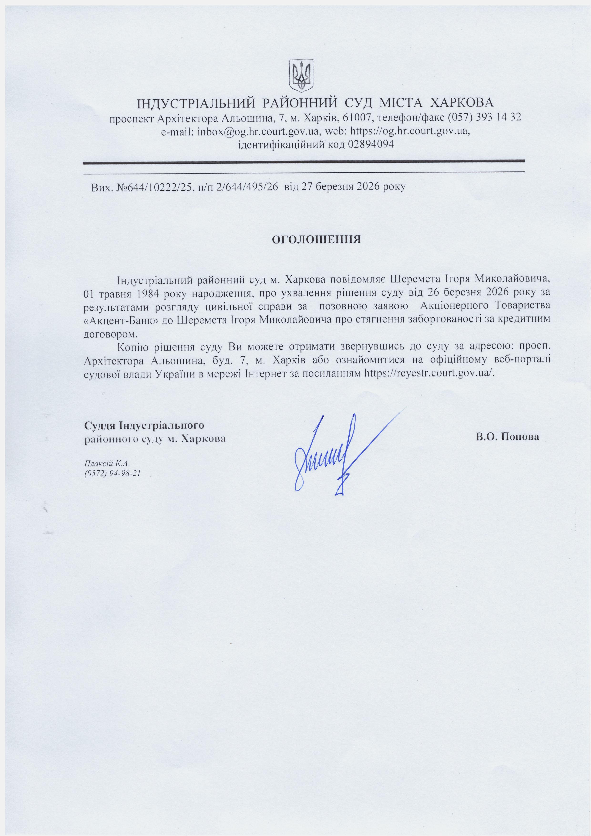 Оголошення про ухвалення рішення суду по справі за позовом АТ "Акцент-Банк" до Шеремет І.М.