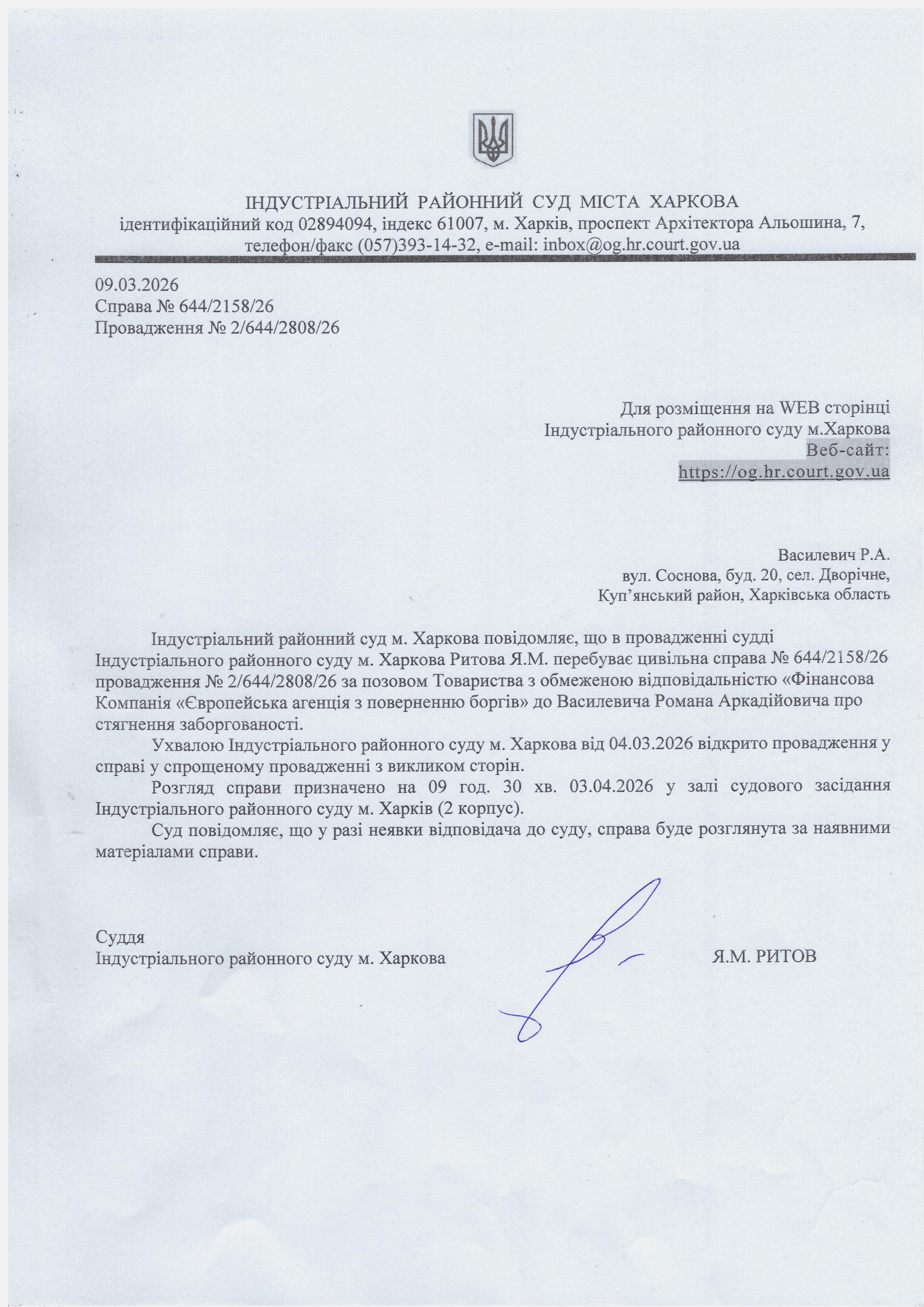Оголошення про виклик до суду відповідача Василевич Р.А.