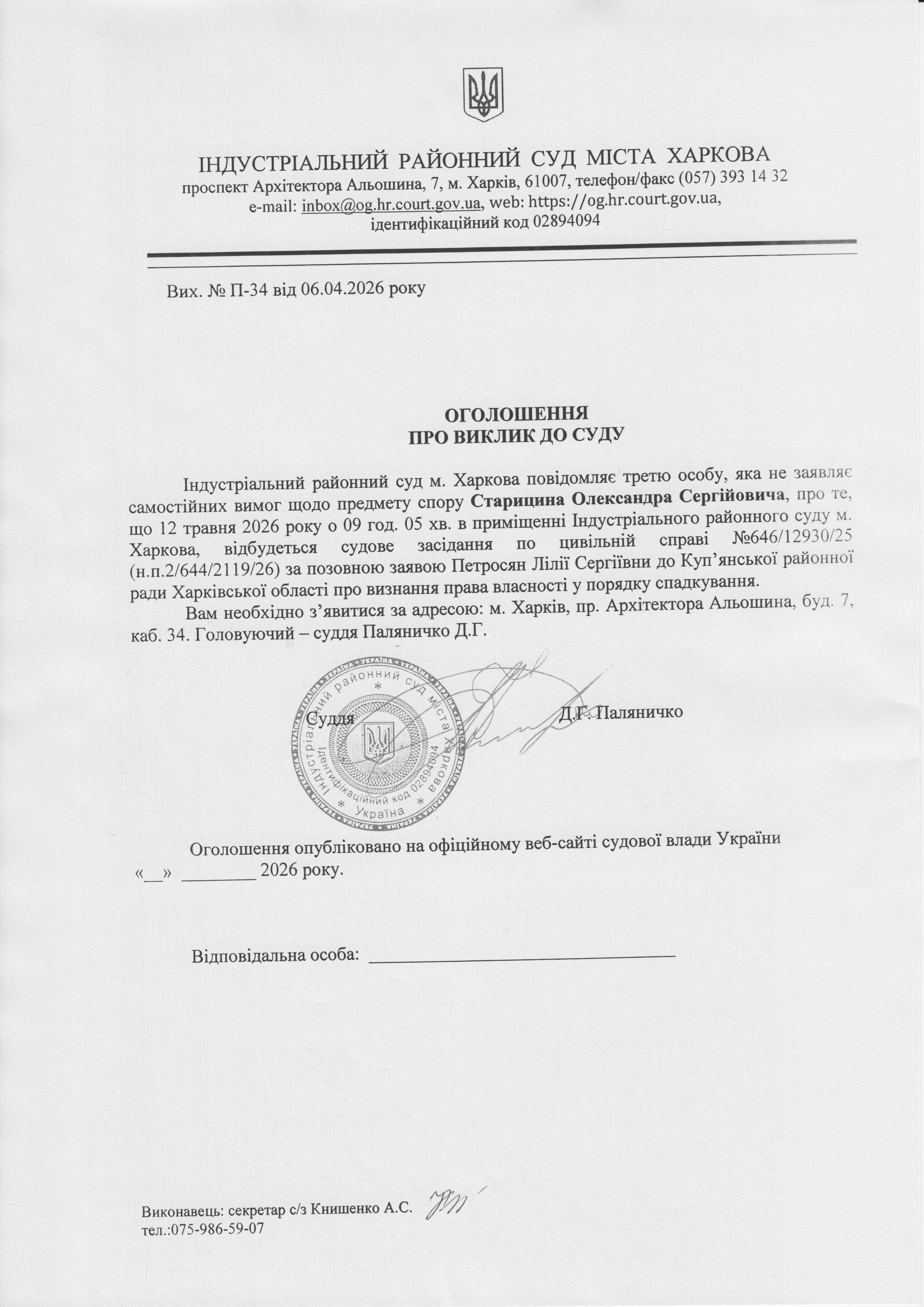 Оголошення про виклик до суду відповідача, третіх осіб, свідків, місце проживання (перебування) яких невідоме